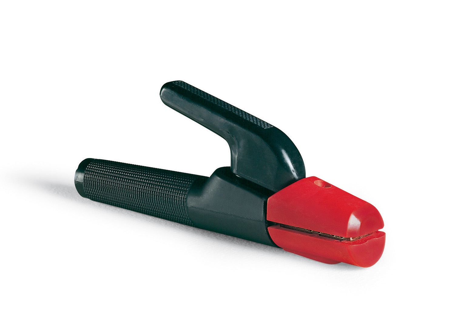 Pinza porta elettrodo con corpo in ottone pressofuso e rivestimenti isolanti in materiali termoindurenti, non infiammabili e anticalore. Serraggio cavo mediante grani a cava esagonale. Molla a compressione isolata. Leva in ottone pressofuso isolata con materiale termoindurente. Fissaggio elettrodo in 9 posizioni.