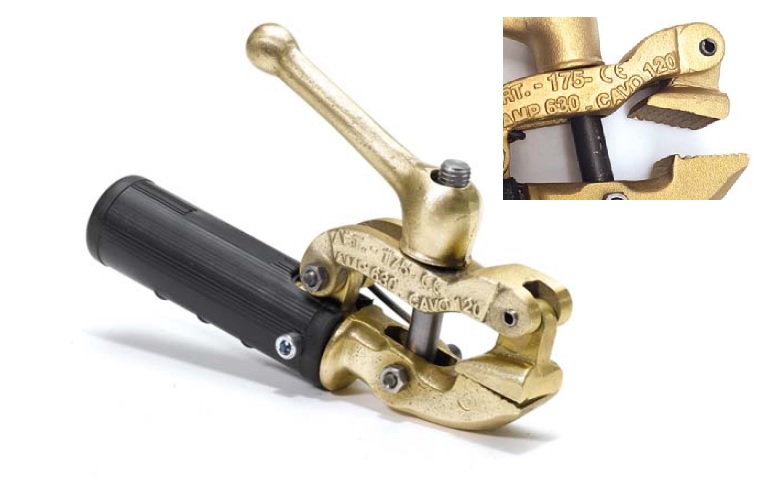 Morsetto di massa con fissaggio a leva, testina superiore di contatto oscillante per un contatto ottimale, speciale impugnatura in gomma con anima in metallo, specifico per postazioni fisse ed alti amperaggi.