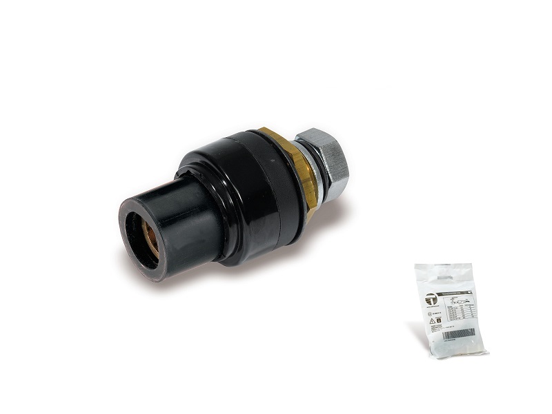 Presa pannello completamete isolata per connessione rapida di pinze/morsetti alla macchina saldatrice, corpo in ottone con ghiera esterna in materiale termoindurente, ignifugo e anticalore.