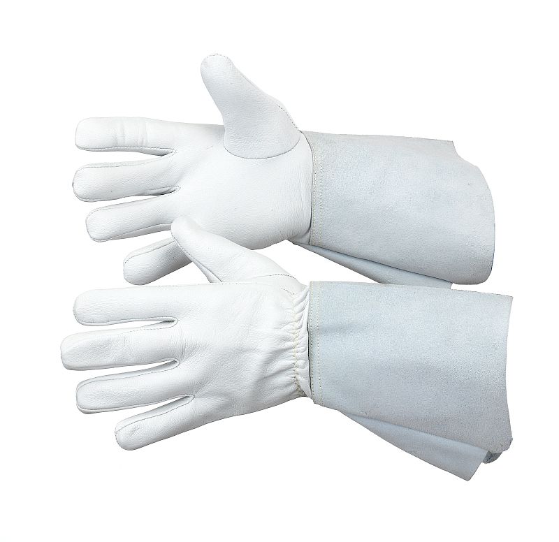 Guanto 5 dita per saldatura TIG (GTAW) , in pieno fiore capretto, manichetta in crosta 15 cm. Cuciture in filato Kevlar®.