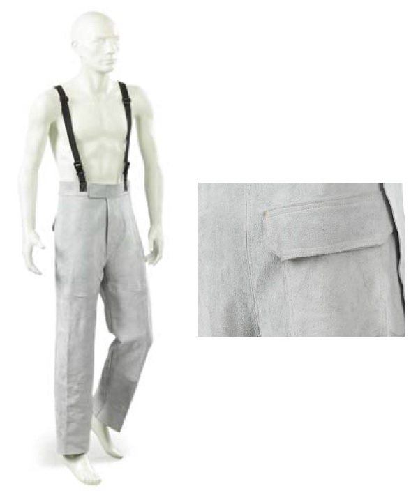 Pantalone in pelle crosta bovina, con tasca posteriore e bretelle con ganci automatici.