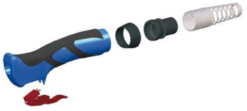 Kit impugnatura composto da: impugnatura blu con gomma nera, pulsante plus prolungato, ghiera in nylon, snodo, molla, viteria.