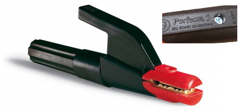 Pinza porta elettrodo con corpo in ottone pressofuso e rivestimenti isolanti in materiali termoindurenti, non infiammabili e anticalore. Serraggio cavo mediante grani a cava esagonale. Molla a compressione isolata. Leva in ottone pressofuso isolata con materiale termoindurente. Fissaggio elettrodo in 9 posizioni.