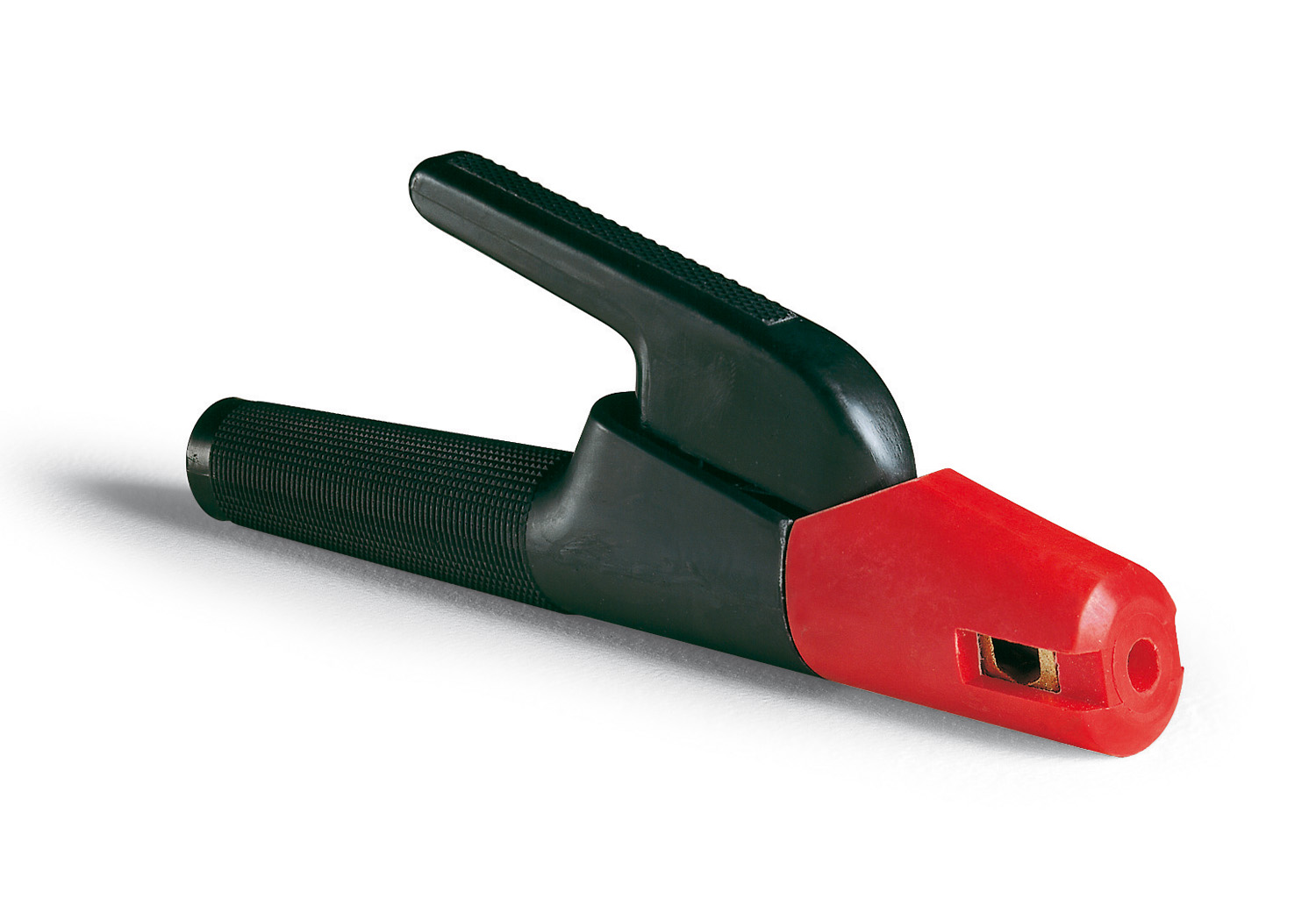 Pinza porta elettrodo con corpo in ottone pressofuso e rivestimenti isolanti in materiali termoindurenti, non infiammabili e anticalore. Serraggio cavo mediante grani a cava esagonale. Molla a compressione isolata. Leva in ottone pressofuso isolata con materiale termoindurente. Puntale in unico pezzo, fissaggio elettrodo in 5 posizioni.