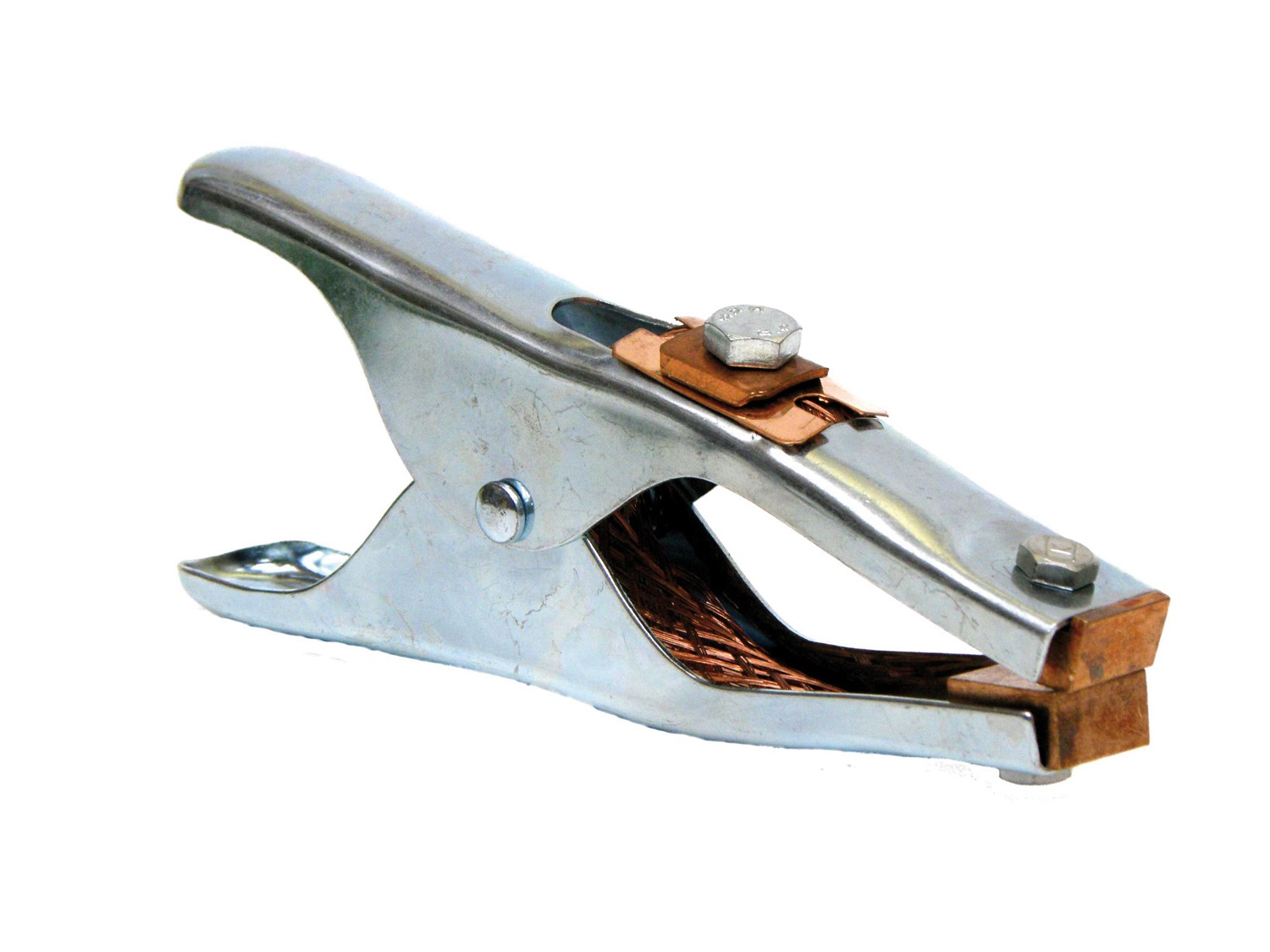 Morsetto di massa con struttura in acciaio trattato antiossidazione. Contatti in ottone e connessione con treccia in rame. Serraggio del cavo con lamella in rame avvolgifili e serracavo in acciaio ramato.
