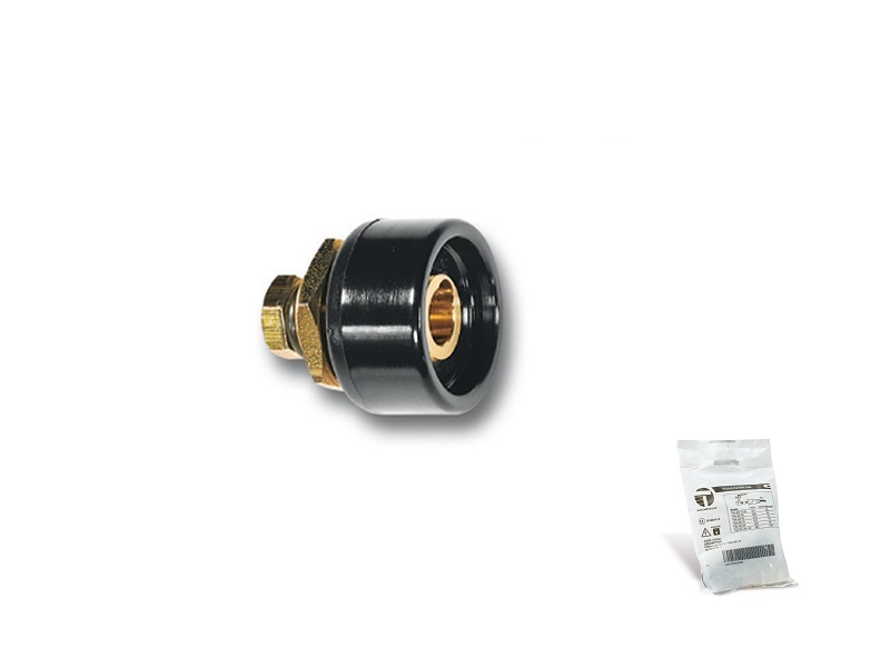 Presa pannello per connessione rapida di pinze/morsetti alla macchina saldatrice, corpo in ottone con ghiera esterna in materiale termoindurente, ignifugo e anticalore.