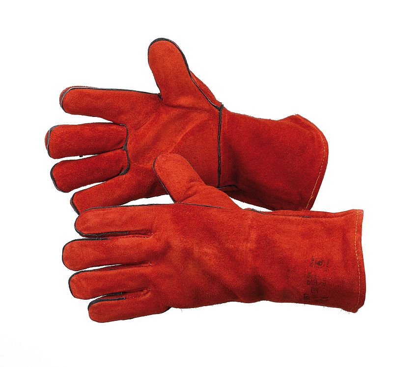 Guanto a 5 dita per saldatura, in pelle crosta bovino rossa, fodera interna in cotone e cuciture in filato kevlar®; manichetta in pelle crosta da 15 cm.