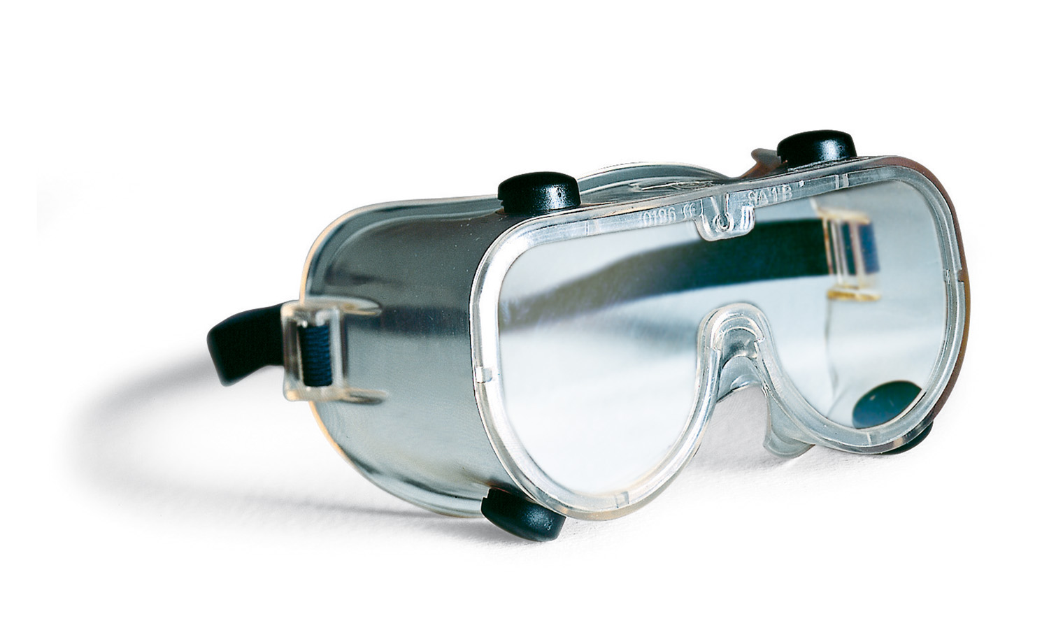 Mascherina in materiale plastico morbido con elastico regolabile. Protezione lenti piane antiappannanti.