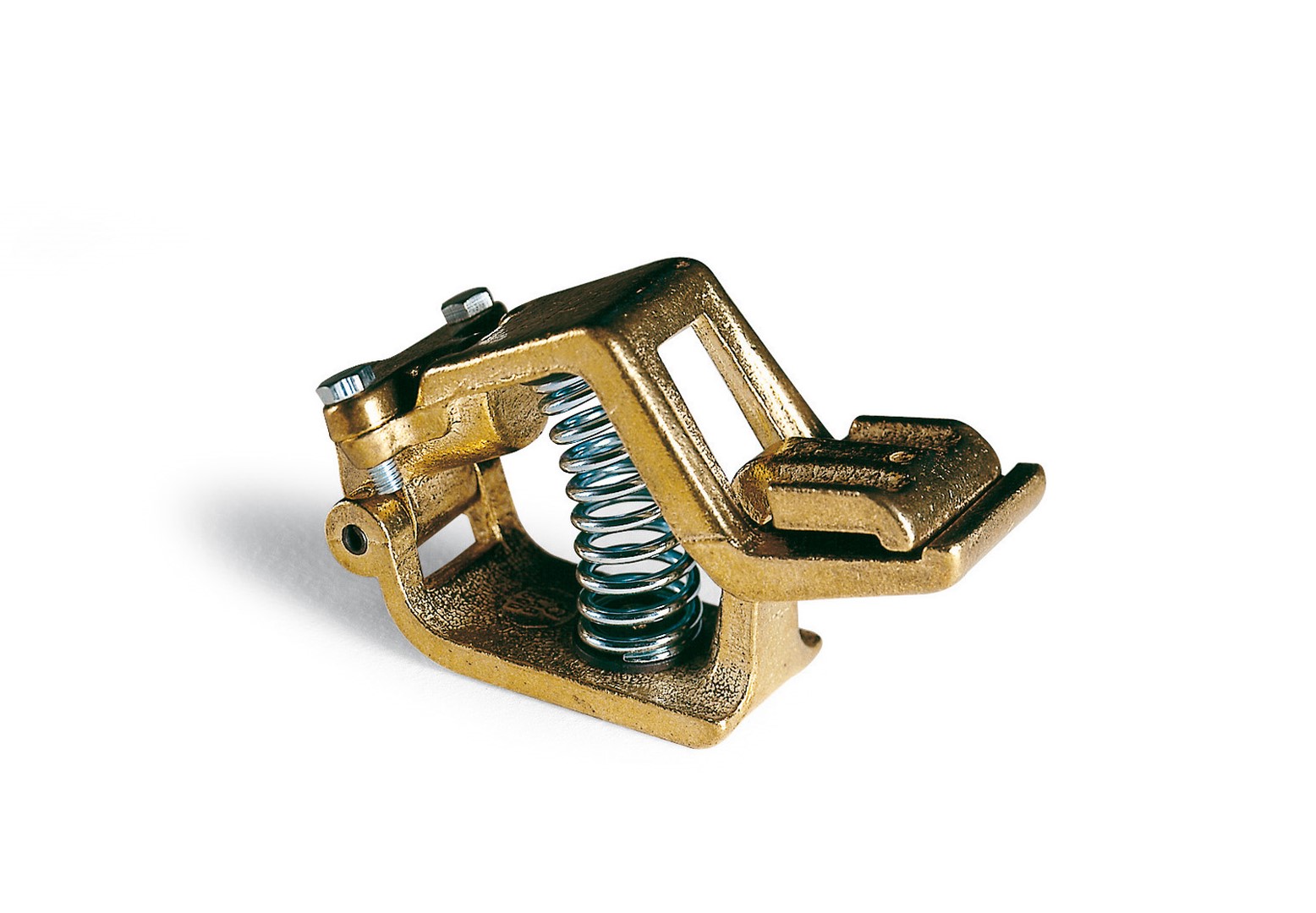 Morsetto di massa in ottone con fissaggio a molla isolata, specifico per postazioni fisse ed alti amperaggi.