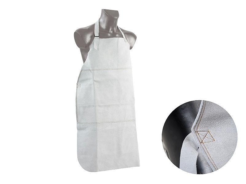 Grembiule in pelle crosta con ampio rinforzo cucito all'interno, lacci in pelle con ganci automatici.