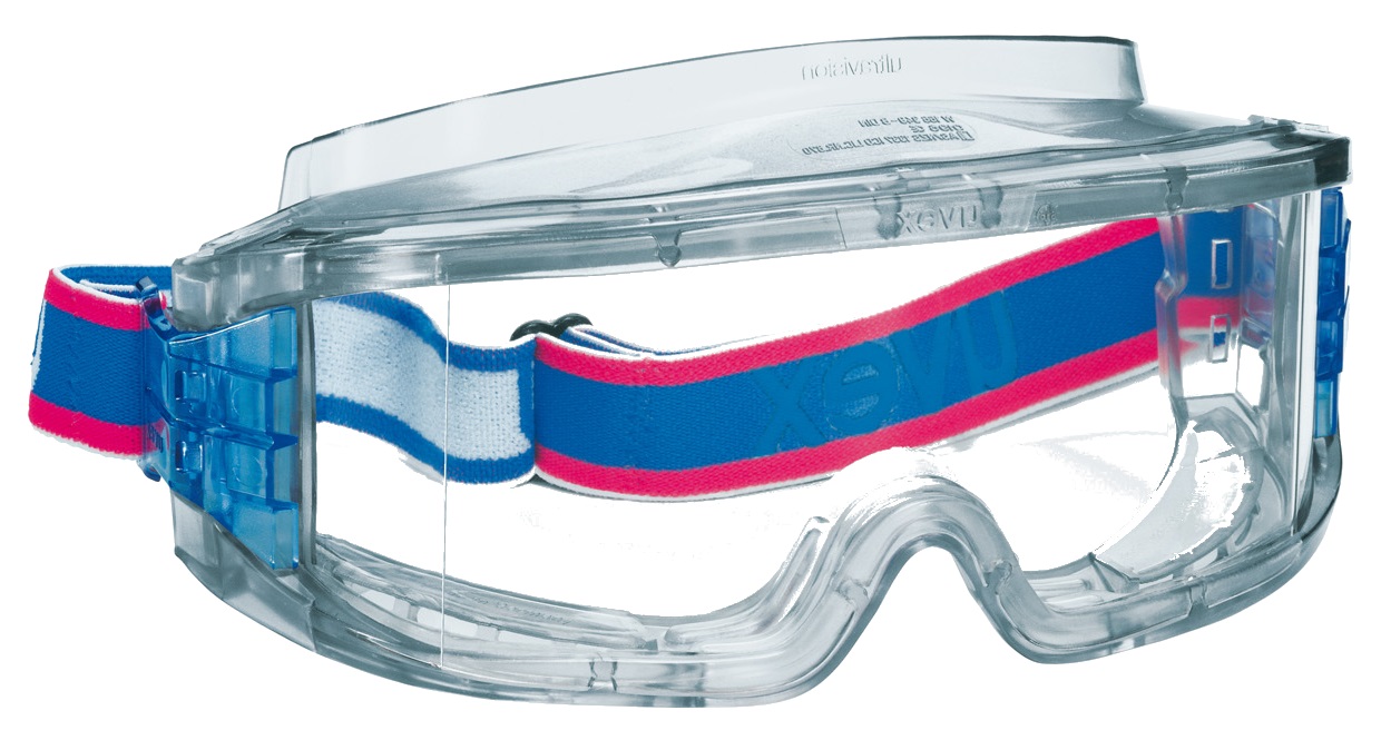 Occhiale a mascherina con lente trasparente antiappannante e banda elastica regolabile.