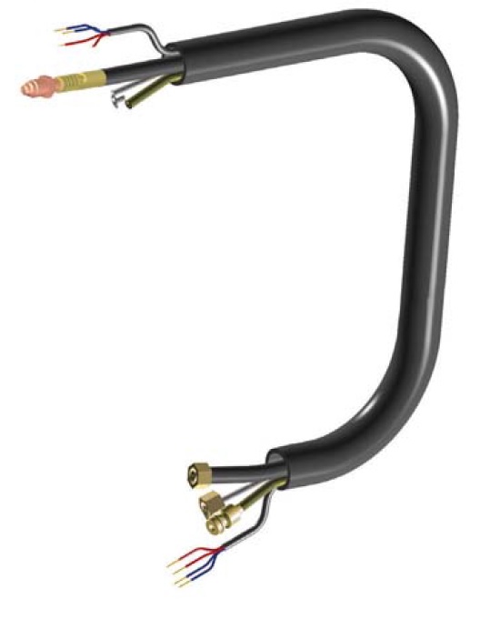 Pulsante francese Crouzet, copertura esterna in gomma, cavo Potenza coassiale con connettore da 50mmq, connessione tubo gas con raccordo M12x1 e tubi acqua con connettori rapidi.